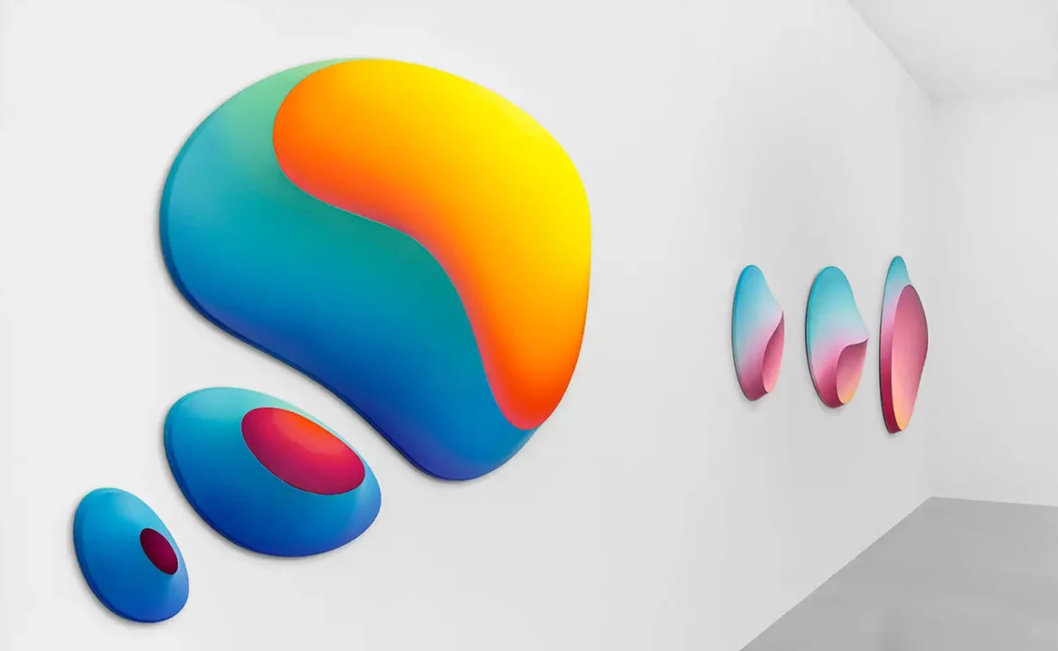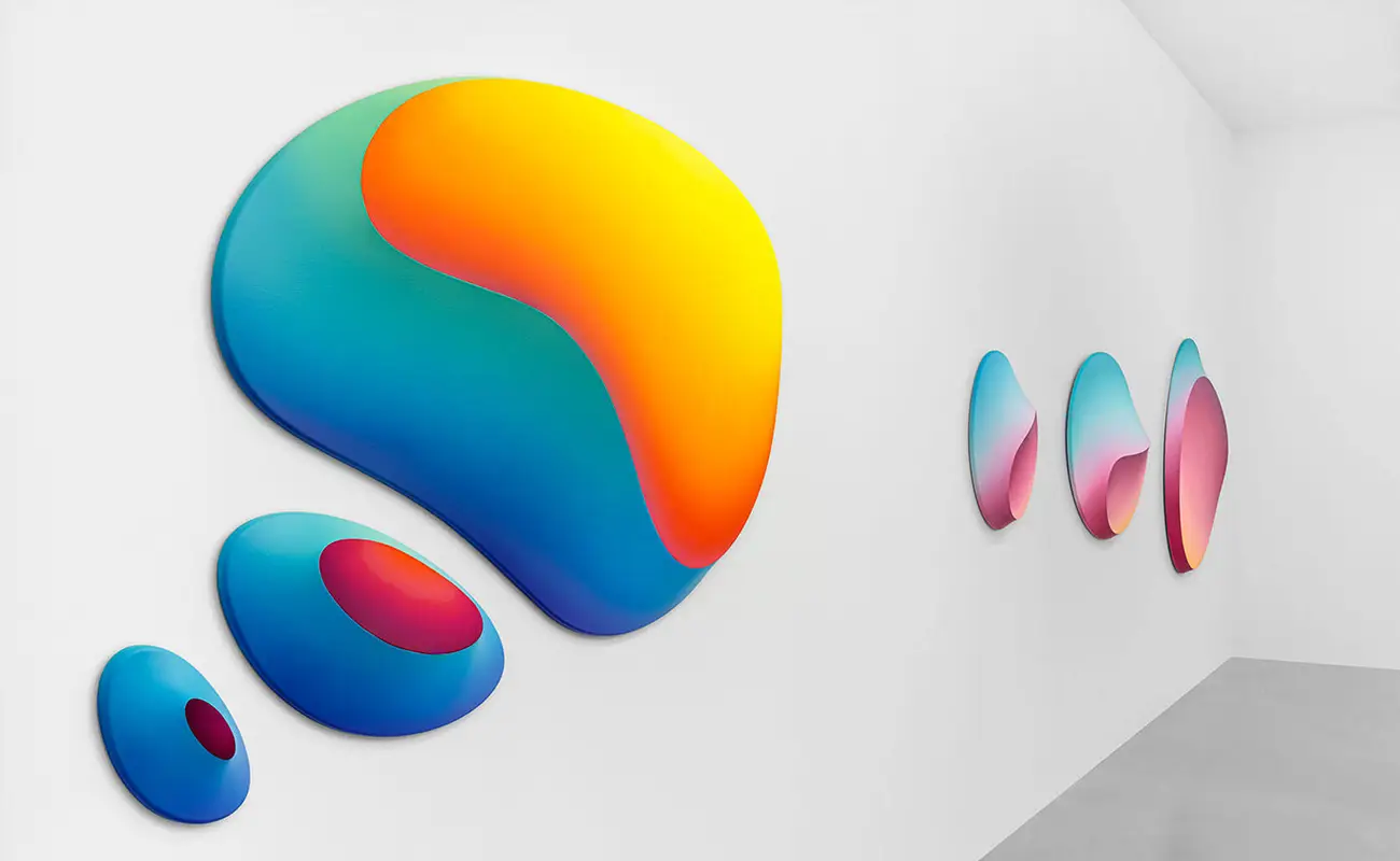 Kaláb’s work has come to inhabit a unique space between sculpture and painting, where neither discipline dominates but instead enters into a kind of visual dialogue. His painted works often possess sculptural qualities, with stretched canvases bulging from the wall in organic protrusions, while his three-dimensional pieces are rarely left unpainted. Shape and color are his true mediums, interchangeable and inseparable. He favors the circle not simply as a motif but as a conceptual anchor—a container for tension, motion, and energy. The interplay of convex and concave surfaces, layered gradients, and vibrant hues creates a dynamic in which the work seems to oscillate before the viewer’s eyes, alive with movement even in stillness.
