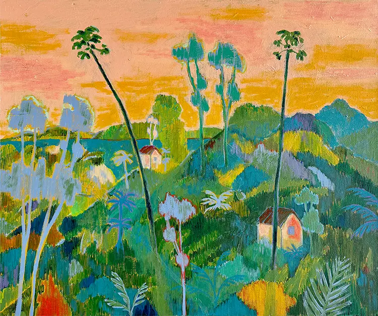 Central to his practice is the interplay between what is seen and what is felt. While inspired by both interior and exterior environments, Jasper’s work resists the literal. He moves away from representational accuracy, opting instead to suggest place through mood, rhythm, and color. This fluidity allows his work to remain open-ended, giving viewers permission to project their own memories and associations onto each scene. His landscapes are less about where they are and more about what they feel like—rich, vivid, and quietly resonant with unspoken stories.
