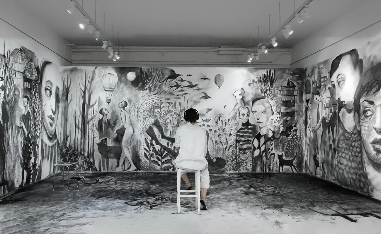 What made this piece particularly significant was its emphasis on process over product. By exposing her movements and decisions in real time, Medea disrupted the traditional separation between artist and audience. The act of drawing became a performance—an unfolding experience shared with others, where the boundary between creation and observation dissolved. The floor became an extension of the canvas, blurring spatial hierarchies and drawing viewers physically into the work. In doing so, she reframed art-making as something porous and participatory, where interpretation begins even before the final form emerges. This shift from static object to living process aligns with her broader philosophy of art as an exploration rather than a destination.